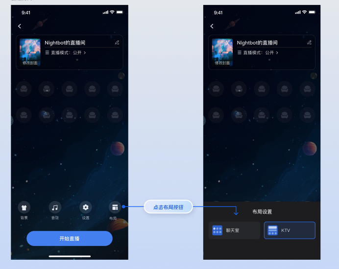 TUILiveKit 语聊提供 2 种布局样式,您可在主播开播前预览页的 UI 交互「布局」入口 选择合适样式: