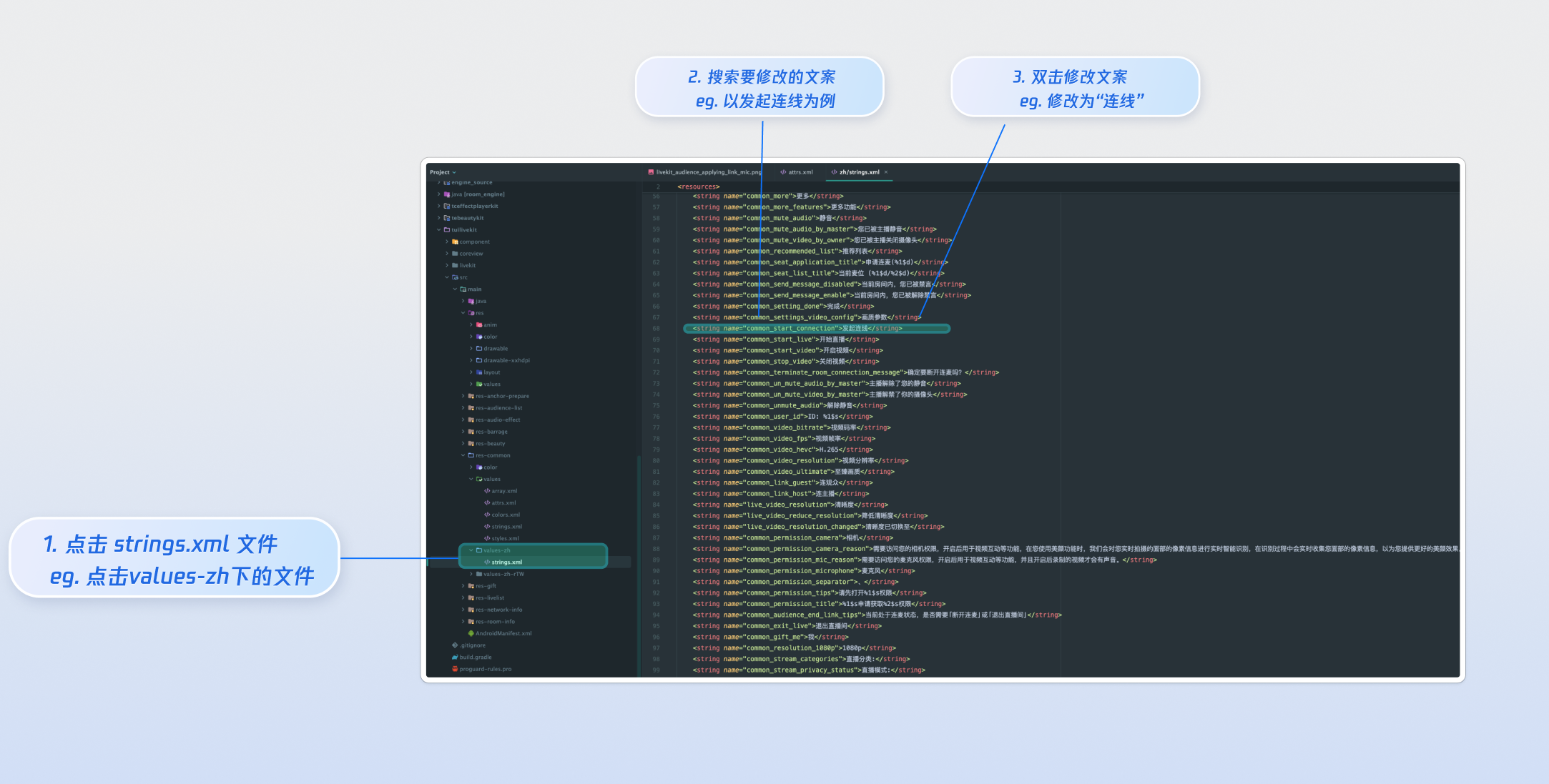TUILiveKit 使用 Android 标准的 字符串资源 (strings.xml) 来管理 UI 所需的文案显示。您可以直接修改 tuilivekit 模块中的 strings.xml 文件,以实现文案自定义。