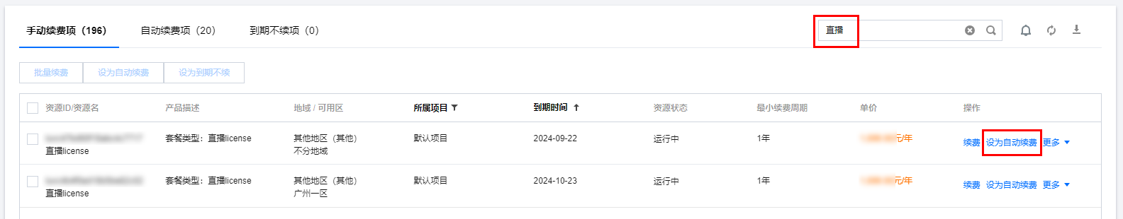 1. 在左侧菜单栏选择 续费管理,您可以选择到期时间范围并搜索直播 License 的产品名,查看已购买的 License 资源。
