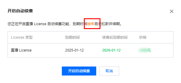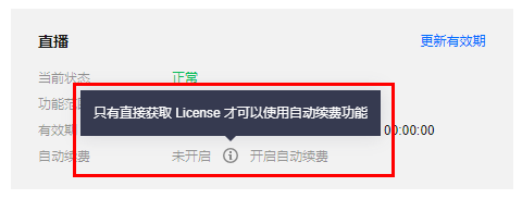 1. License 的自动续费在未开启状态下可点击开启自动续费,到期前3天将按年自动扣款并续期。