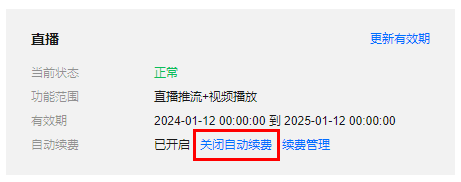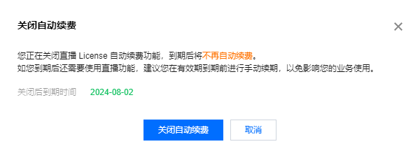 1. License 的自动续费在已开启状态下可点击关闭自动续费,到期后将不再自动续费。
