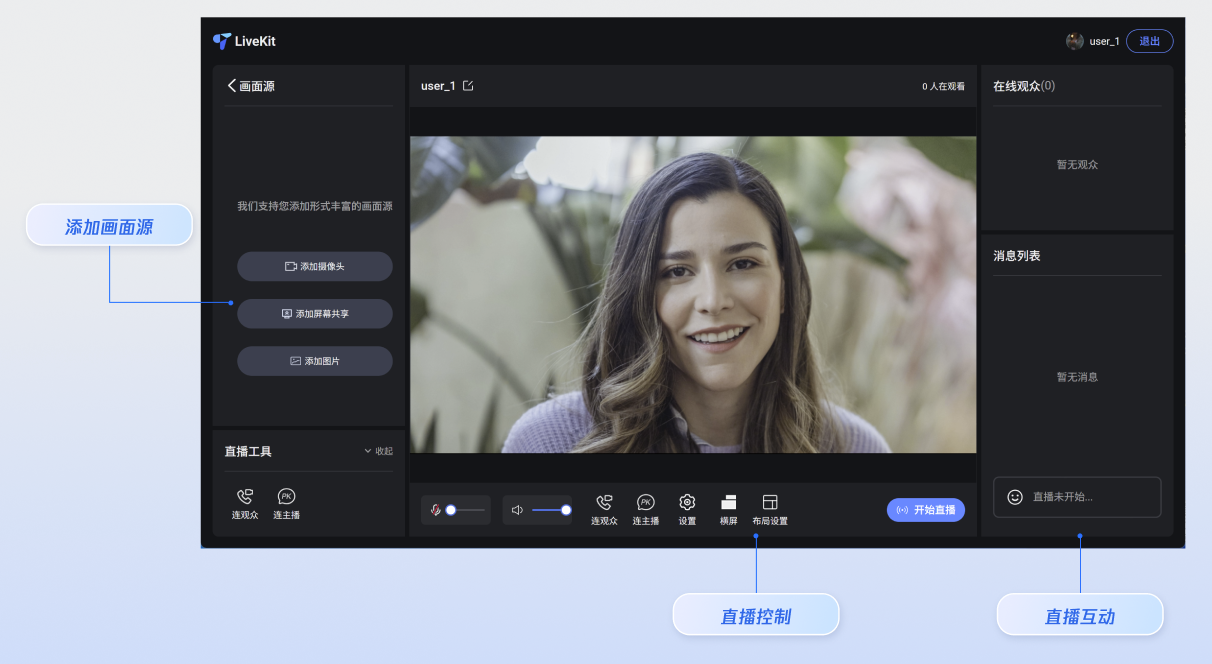 开播页面,如下图所示,首先需要在左侧添加画面源,然后在中间排版区域调整好布局,最后点击下方“开始直播”按钮,开启直播推流。
