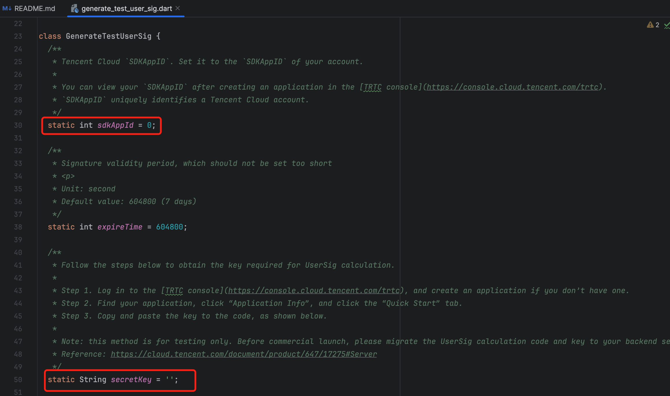 1. 配置 SDKAppID 和 SDKSecretKey:livekit 工程中,将获取的 SDKAppIDSDKSecretKey 填入example/lib/debug/generate_test_user_sig.dart文件: