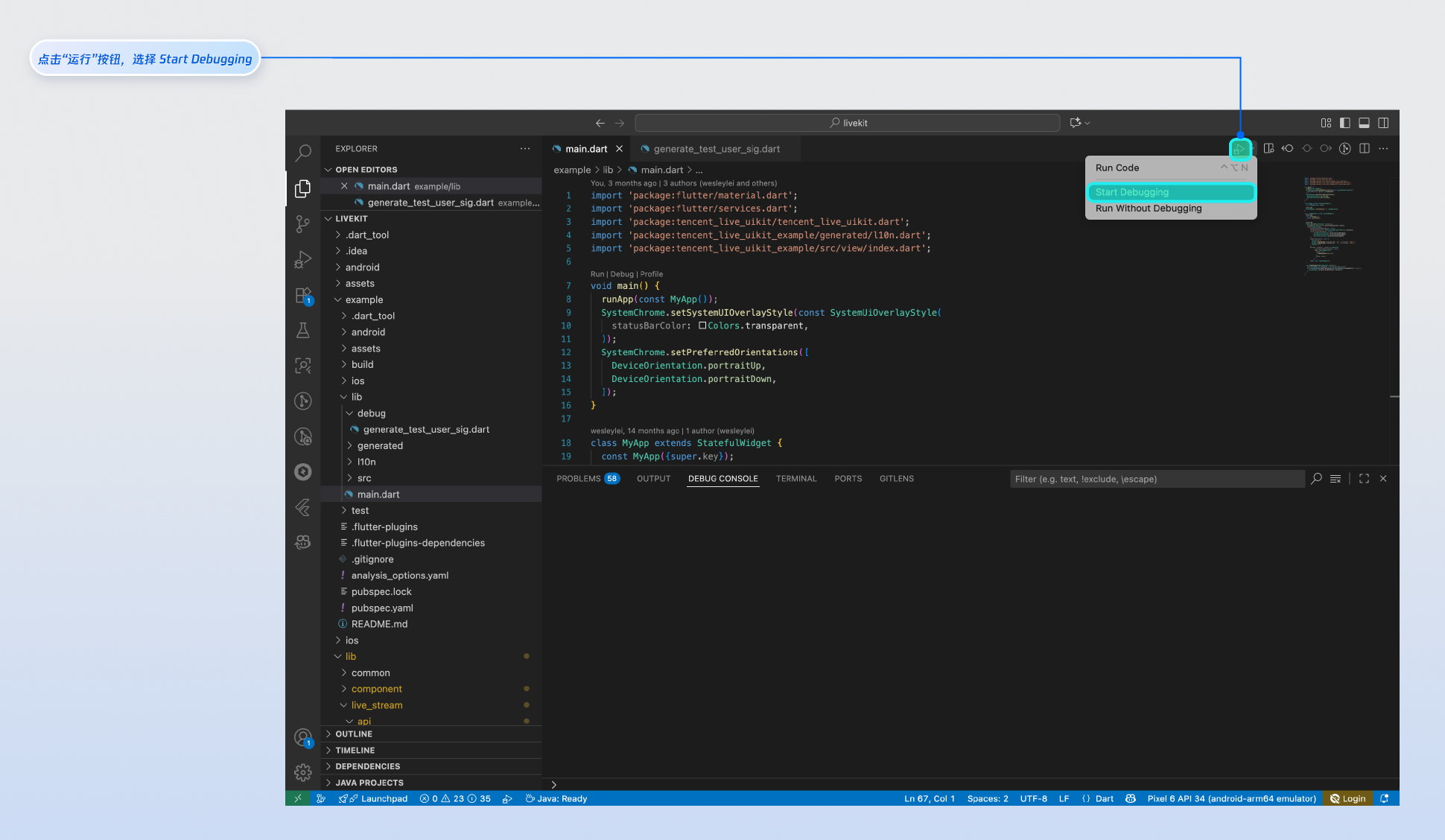 执行以上步骤后, 您可使用 Visual Studio Code 打开 TUILiveKit/Flutter/livekit 目录。