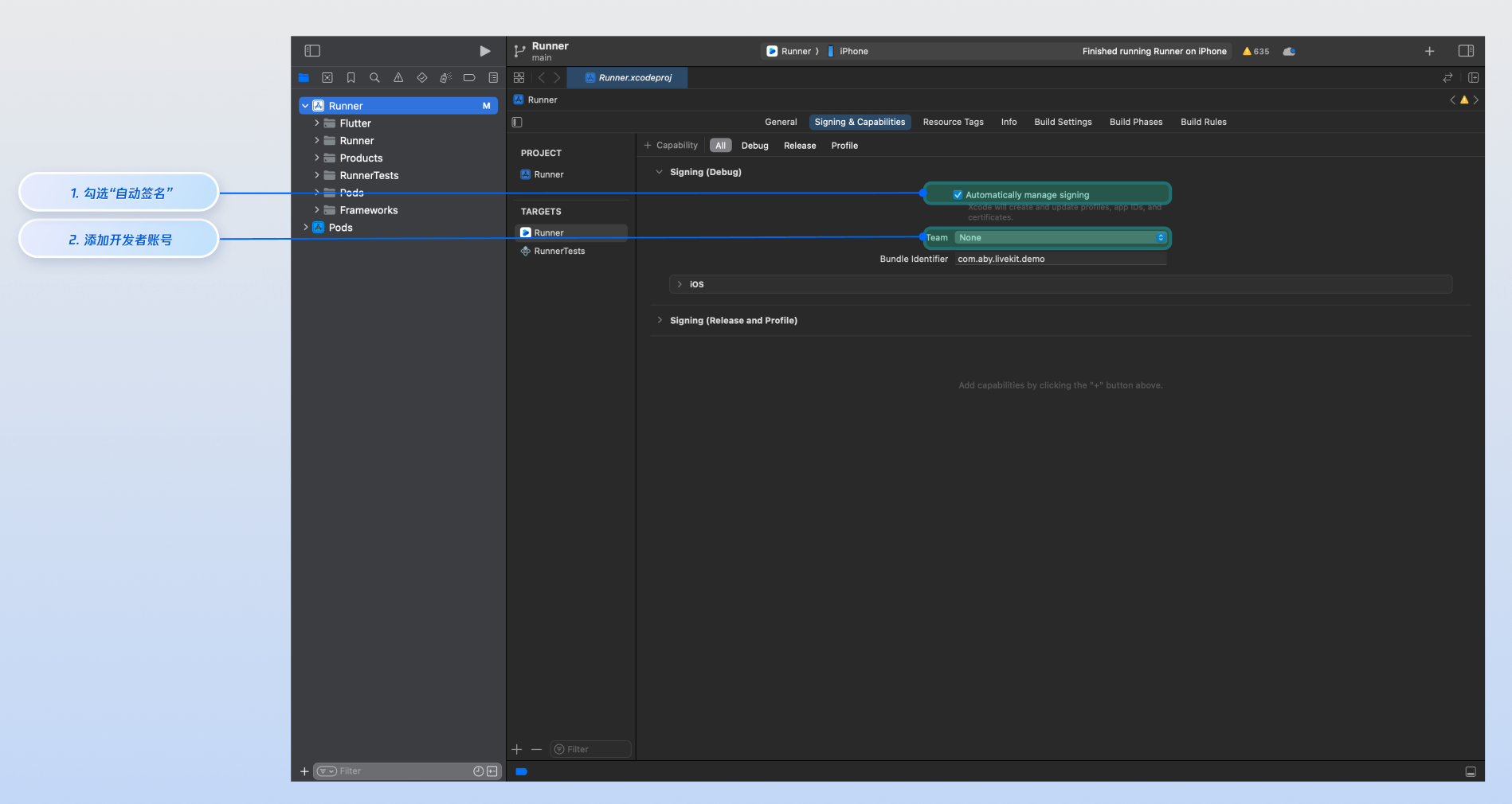 配置苹果开发者签名:在项目 TARGETS 下的 Signing & Capabilities 界面勾选 Automatically manage signing,配置您的苹果开发者账号和 Bundle Identifier
