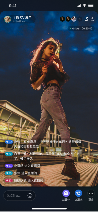 支持超低延迟高清推流、多人连麦/PK、实时美颜、弹幕和礼物互动,轻松搭建互动视频直播场景。