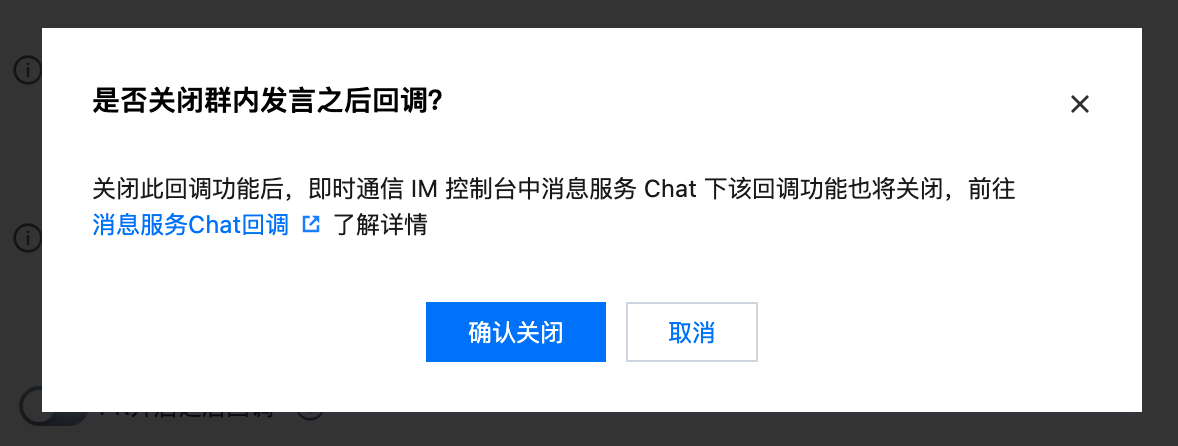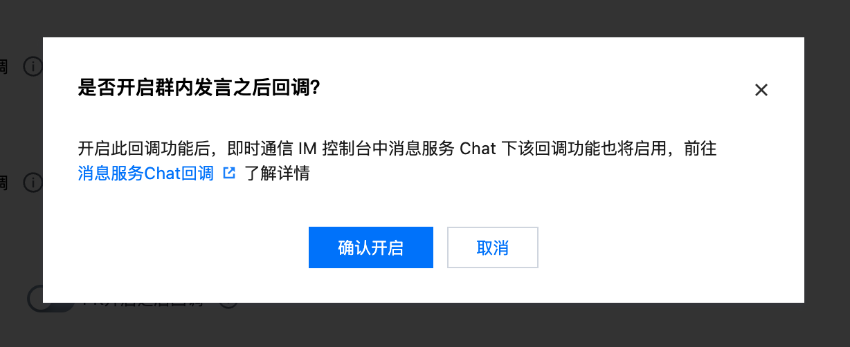 2. 由于社交互动相关回调与消息服务Chat回调功能共用,在社交互动回调区域,开启/关闭所需的回调,需要弹窗确认开启/关闭后生效。