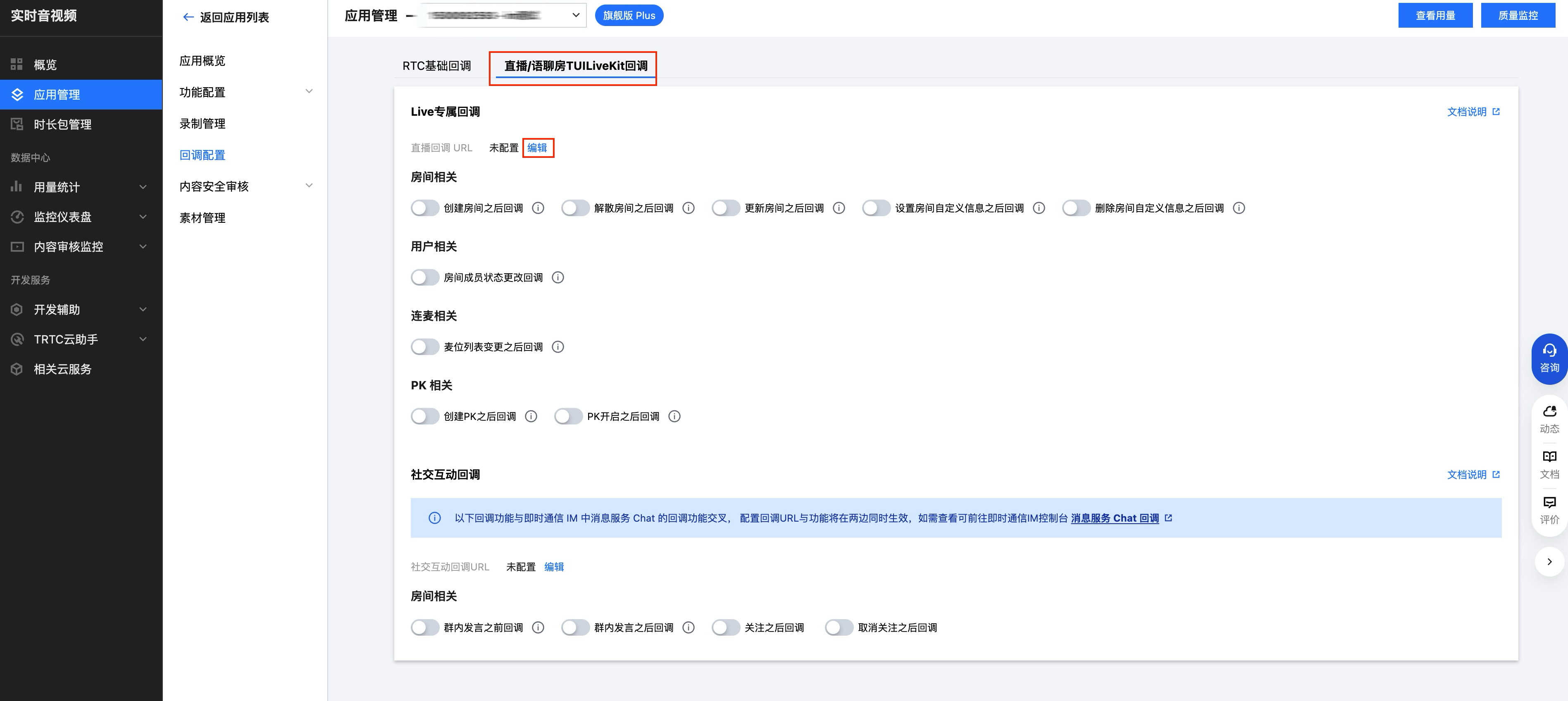 登录 实时音视频控制台 ,单击应用管理,在左侧导航栏选择回调配置,您可以根据实际业务需求配置回调 URL 以及启用哪些回调。