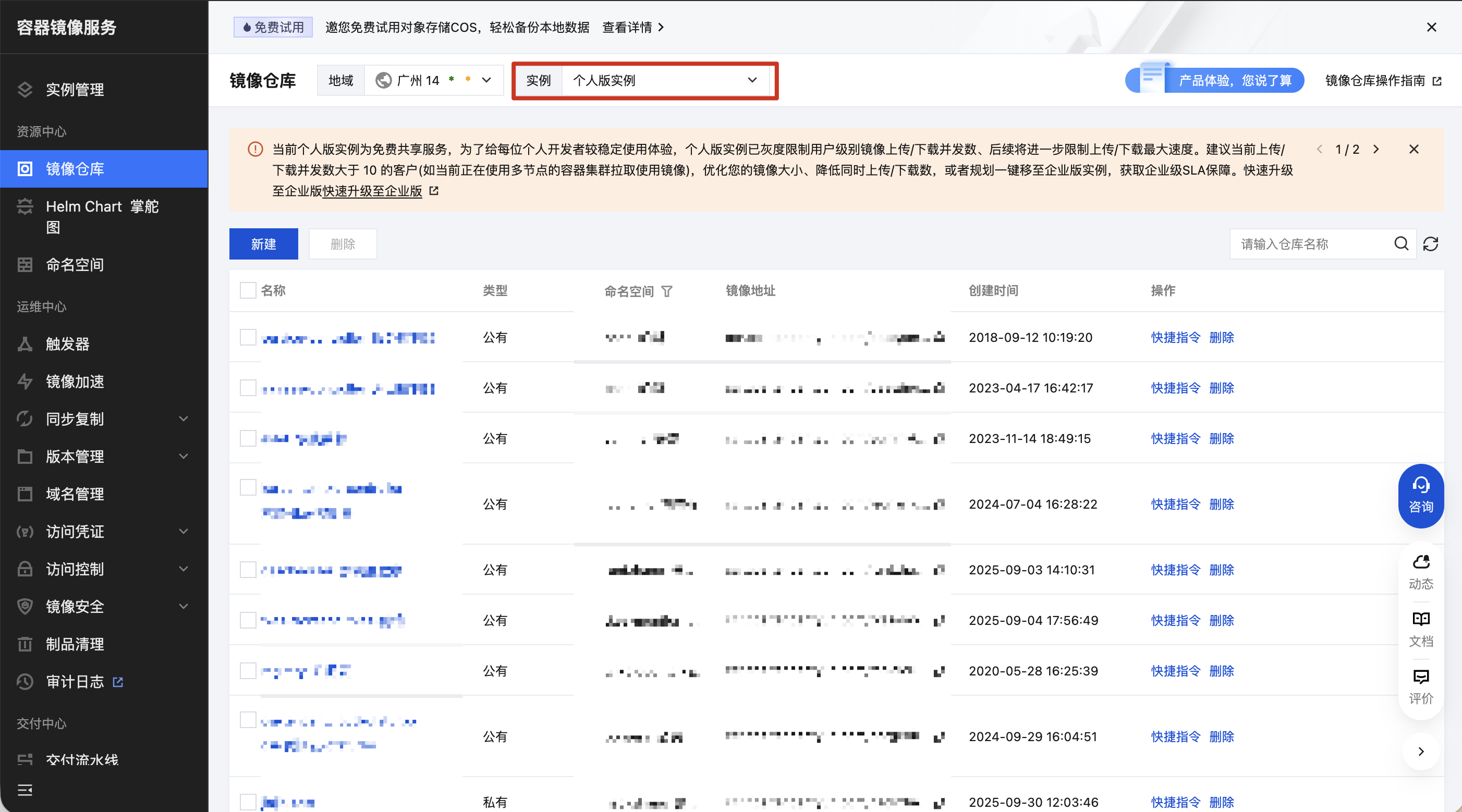 2. 在镜像仓库页面,上传镜像到 CCR(腾讯云容器镜像服务个人版,免费但无 SLA 保证)。操作详情请参见 容器镜像服务个人版快速开始。