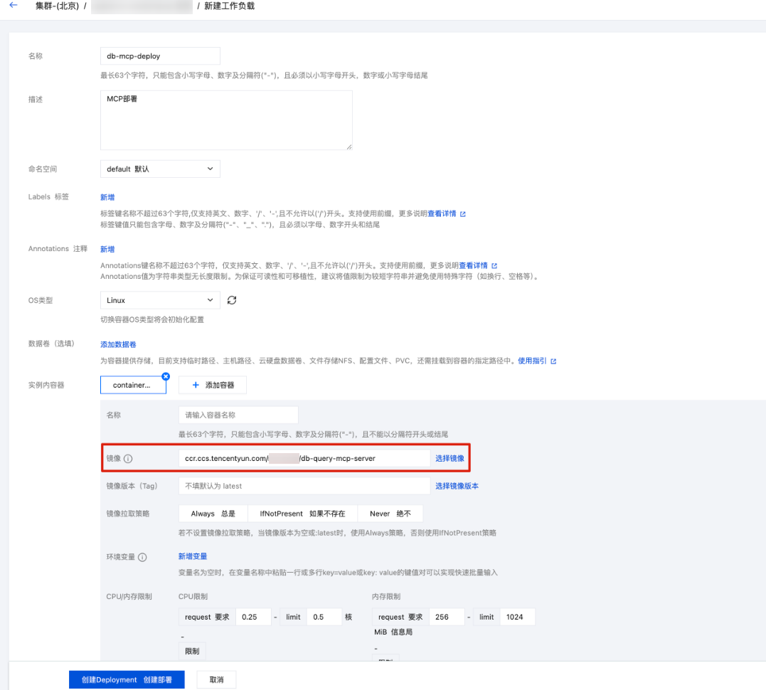 3. 配置 MCP Server 工作负载的基本信息,并选择对应的 MCP Server 镜像。