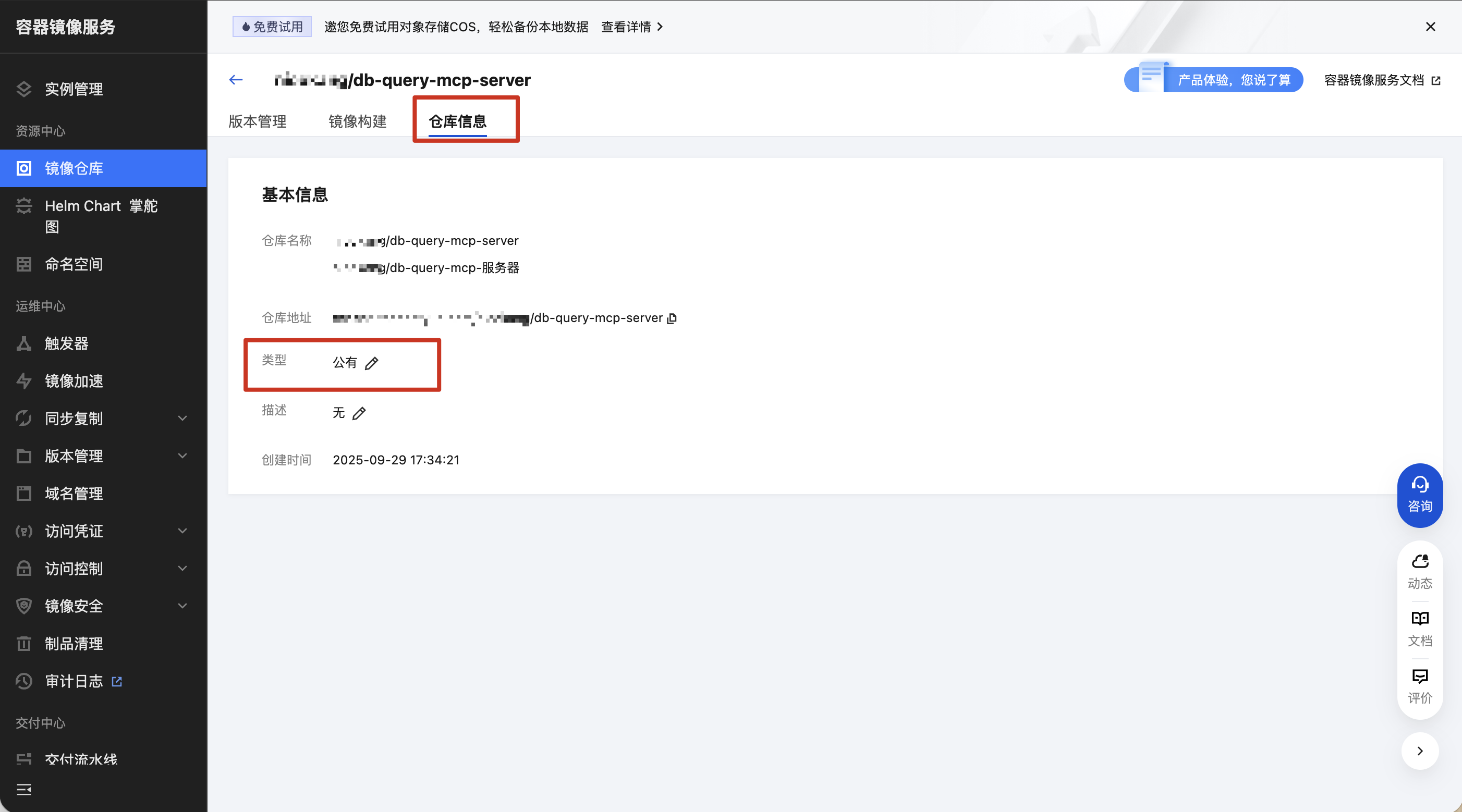 3. 在仓库信息中设置您的镜像为公有镜像,方便部署工作负载时拉取镜像。