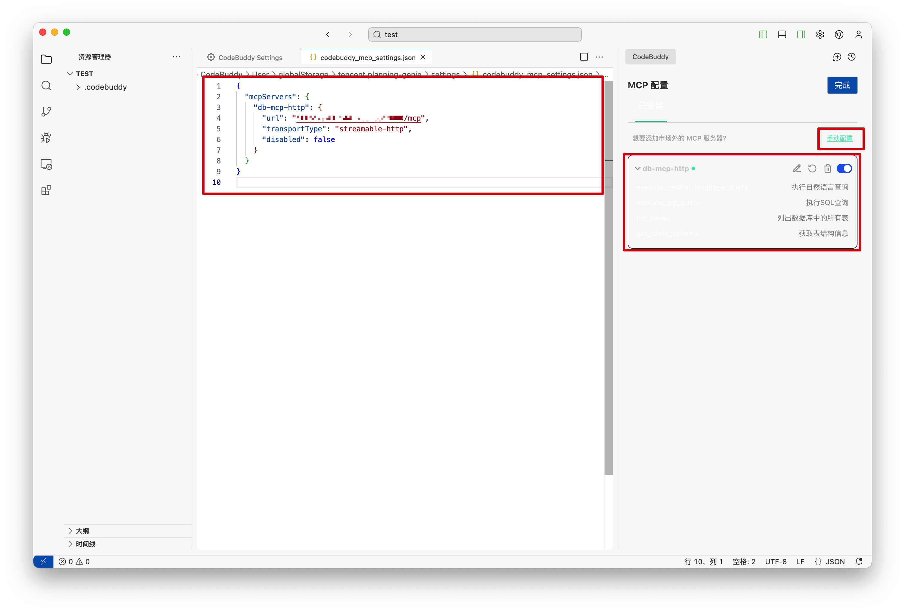 {"mcpServers": {"db-mcp-http": {// 将此处的地址和端口替换为 Service 中的公网访问入口和端口"url": "http://xx.xx.xx.xx:xxxx/mcp","transportType": "streamable-http","disabled": false}}}