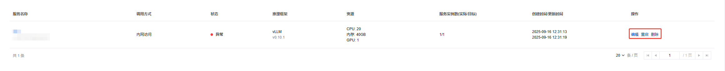 重启服务:单击重启,平台将重新部署服务的所有实例。