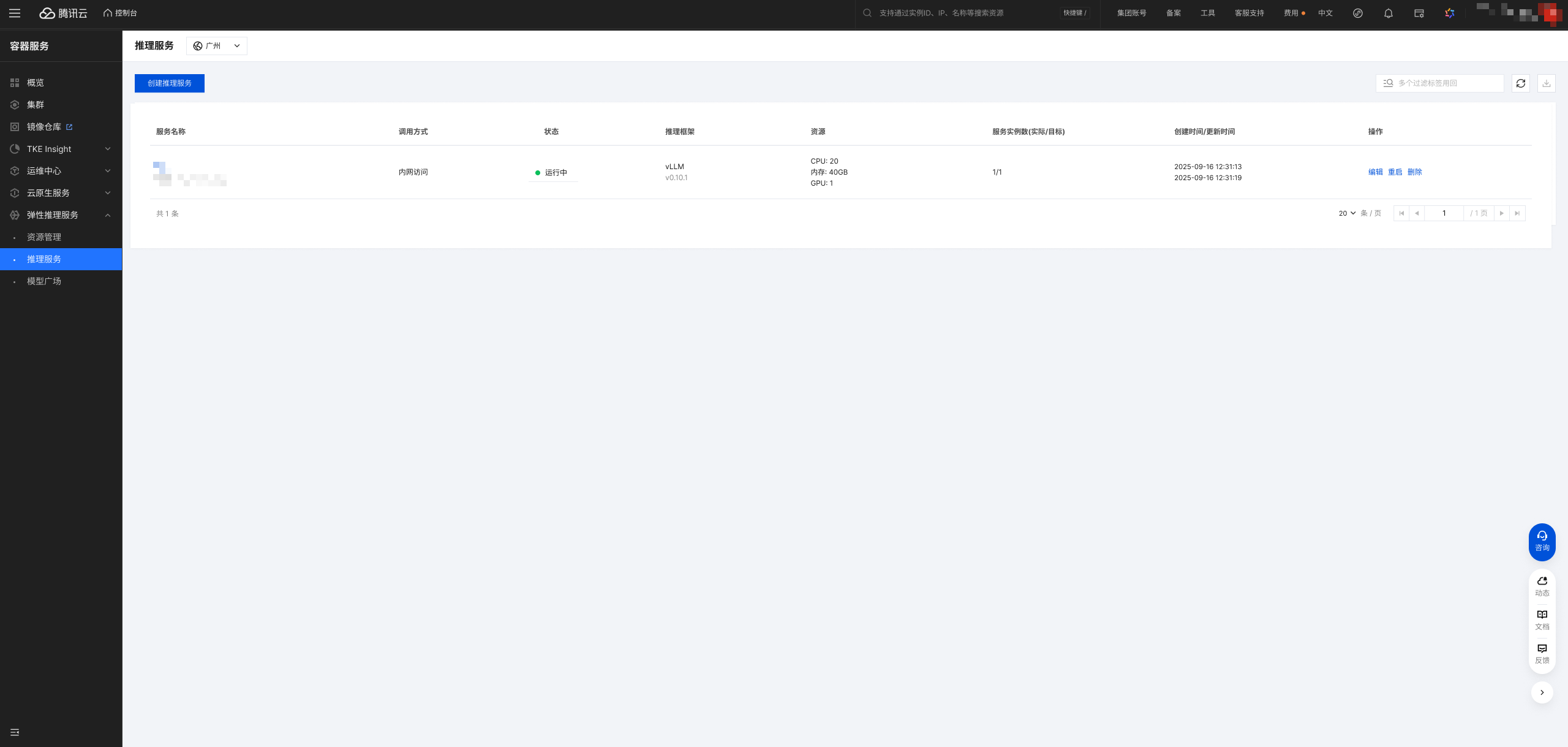 可查看内容:推理服务名、调用方式、运行状态、推理引擎/框架、资源、实例数、创建/更新时间。