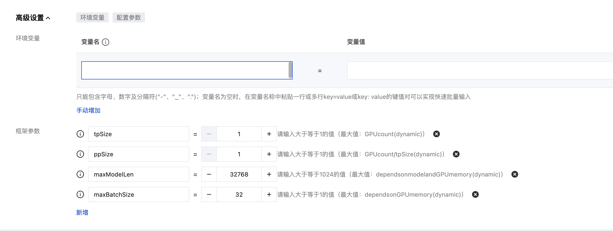 5. (可选) 您可以展开高级配置,对所选推理框架的参数进行精细化调整,具体参数如下表: