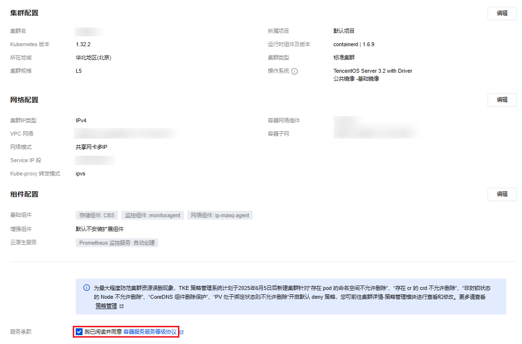 删除保护 | 开启后可阻止通过控制台或云 API 误删除本集群。 |