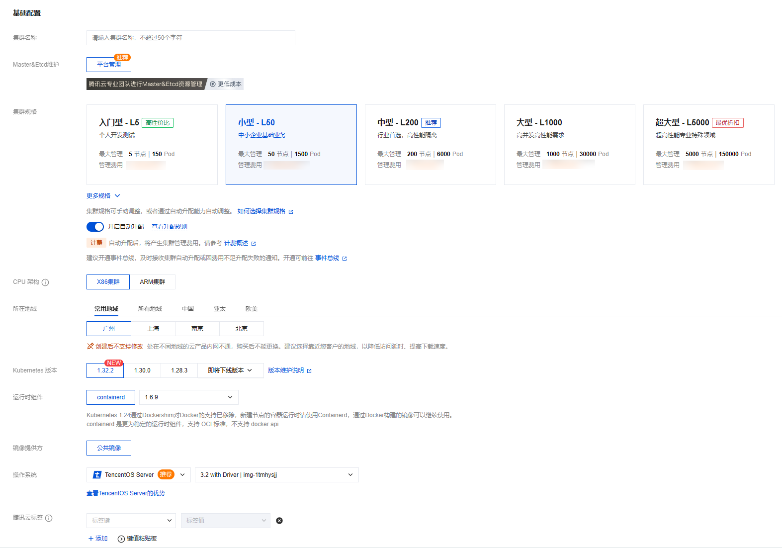 Master&Etcd 维护 | 平台管理:由腾讯云专业团队维护集群控制面组件,需支付一定的管理费用,详情请参见 集群管理费用。 自行维护(已停止新建):需用户自行购买、维护和管理控制面资源,平台不提供服务保障。 |