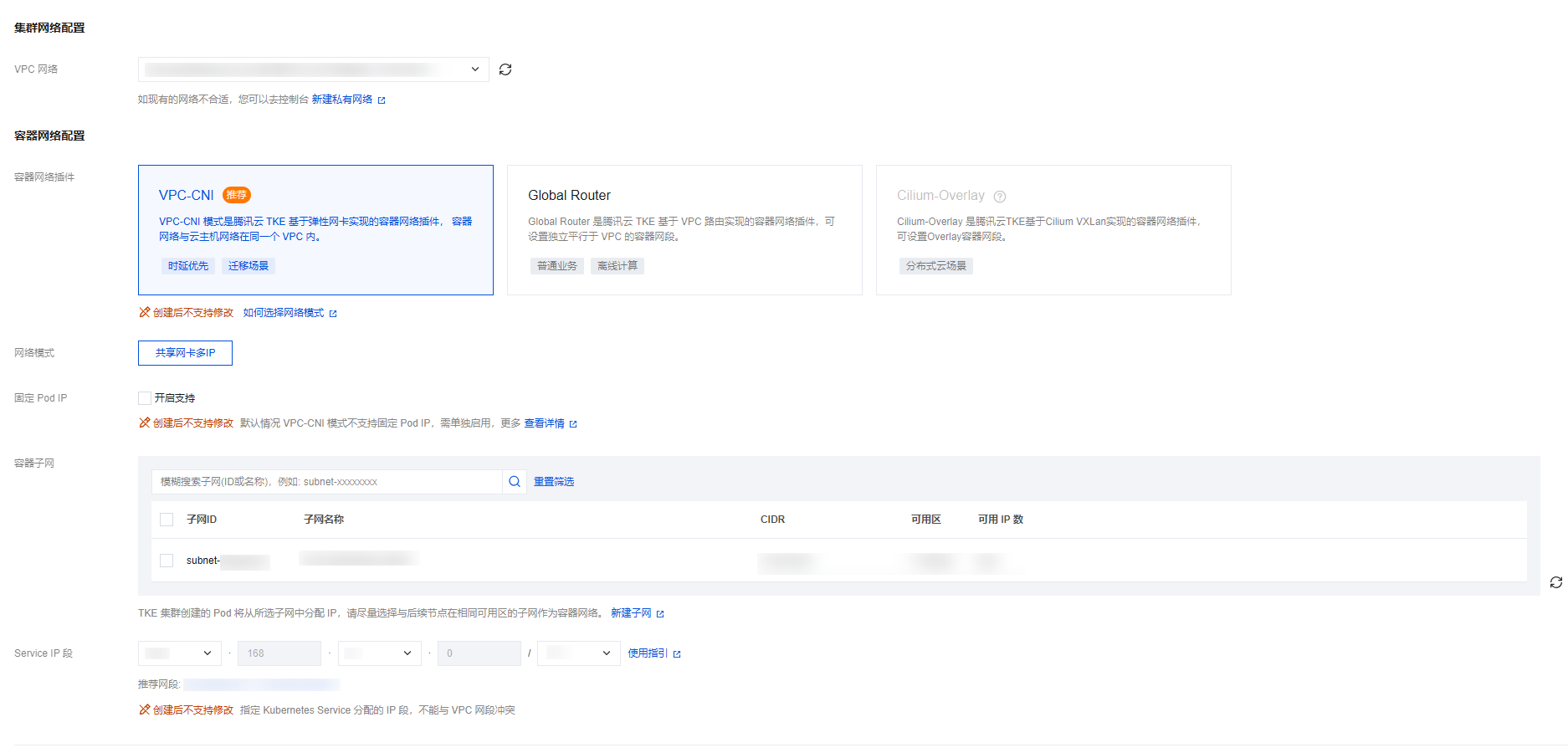 忽略 Service IP 冲突校验 | 忽略后当前集群不会和相同 VPC 下其他集群做 Service CIDR 冲突校验,将导致当前集群和相同 VPC 下其他集群 Service 无法互通。 |