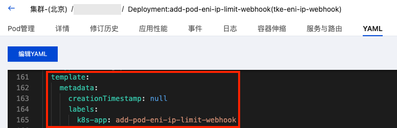 1.4 在 YAML 页签中,查看 template 下的 labels。如下图所示: