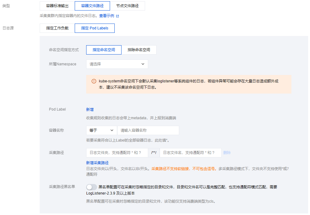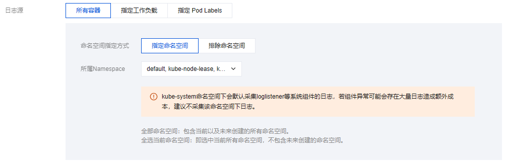 需注意,kube-system 命名空间下会默认采集 loglistener 等系统组件的日志,若组件异常可能会存在大量日志造成额外成本,建议不采集该命名空间下日志。
