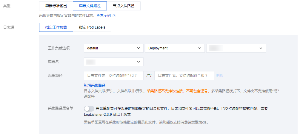 并配置日志源,目前采集类型支持容器标准输出、容器文件路径和节点文件路径。说明: