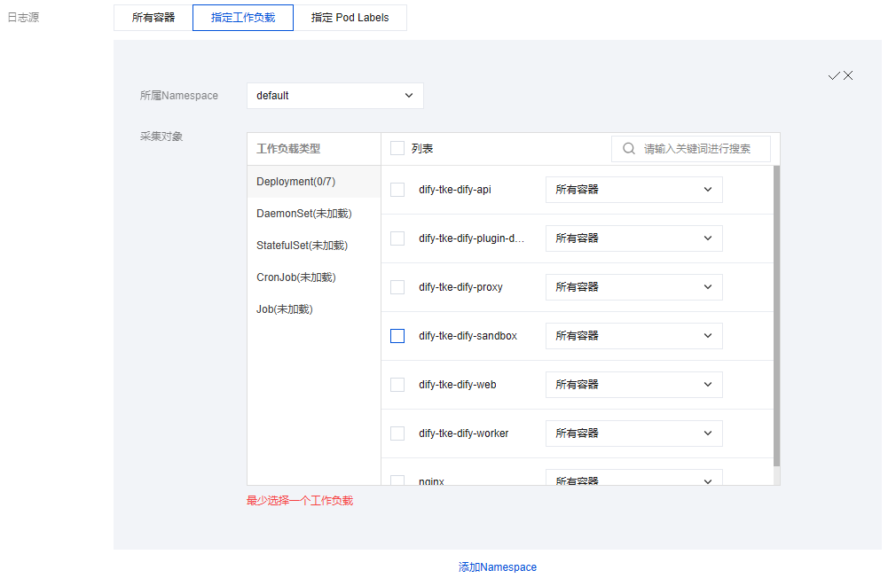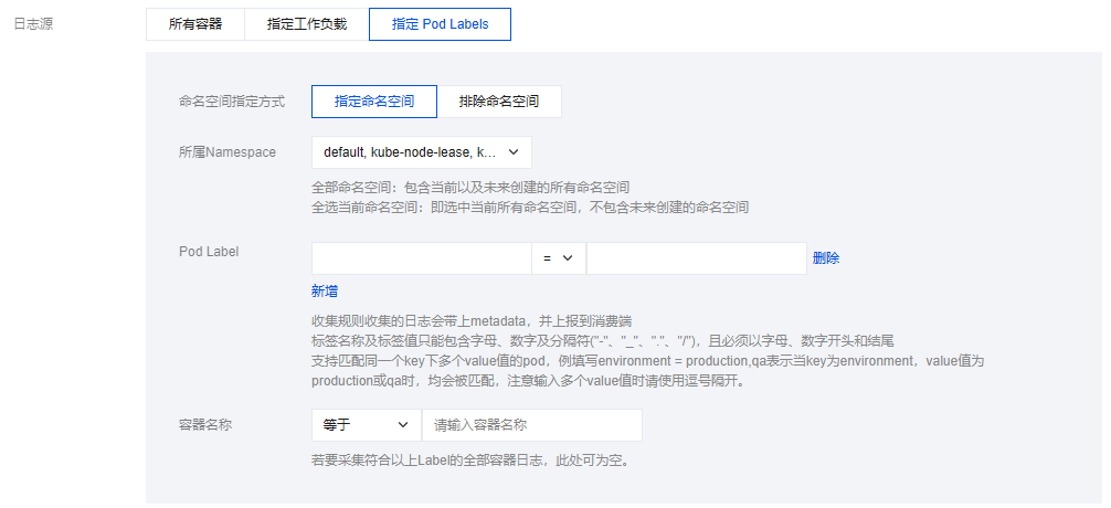 日志源支持所有容器、指定工作负载、指定 Pod Labels 三种类型。如下图所示: