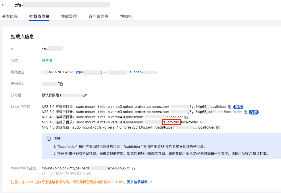 :指用户在文件存储的文件系统里创建的子目录,则该文件系统子目录路径即为 /subfolder
