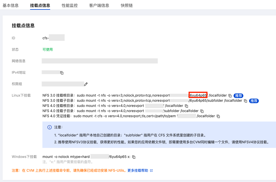 2. 单击挂载点信息,从 “Linux 下挂载” 获取该文件系统的 FSID。如下图所示,