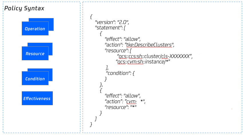 You can define the policy syntax on your own, or create a custom policy by using the policy generator in CAM. You can configure a custom policy based on the following example.