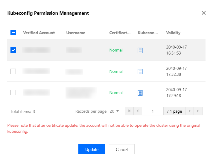 4. In the displayed "Kubeconfig Permission Management" window, select the required authentication accounts and click Update as needed. As shown in the following figure:
