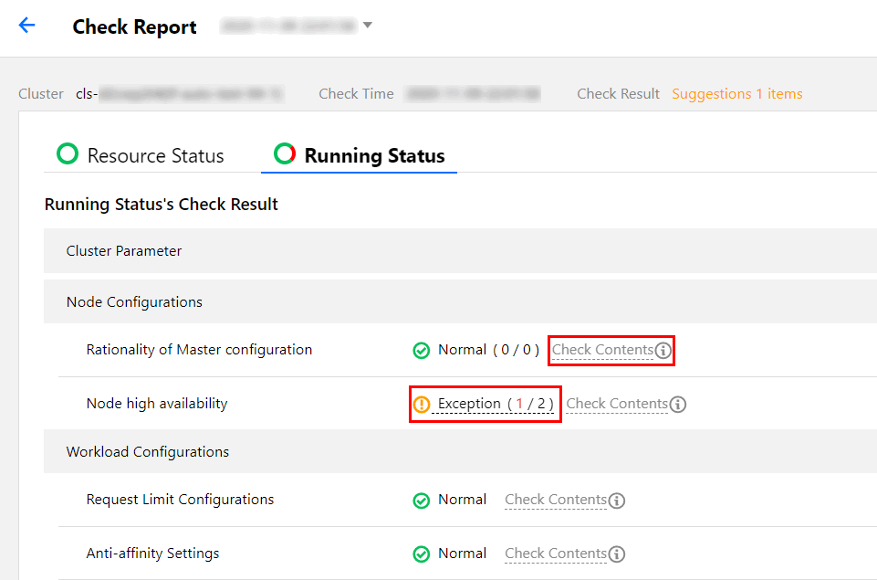On the check report page, select Resource Status and Running Status to view the resource status and exceptions, respectively. Click Check Items to display the specific check items, and click Exceptions to view the exception level, description, cause, impact, and rectification suggestions, as shown below: