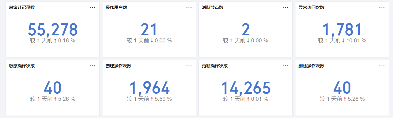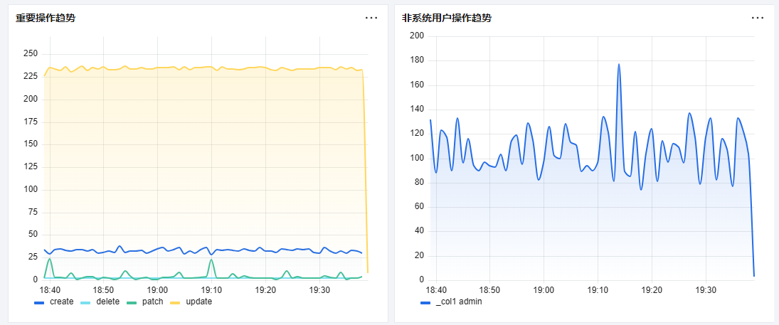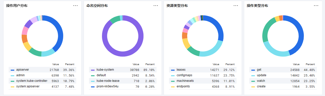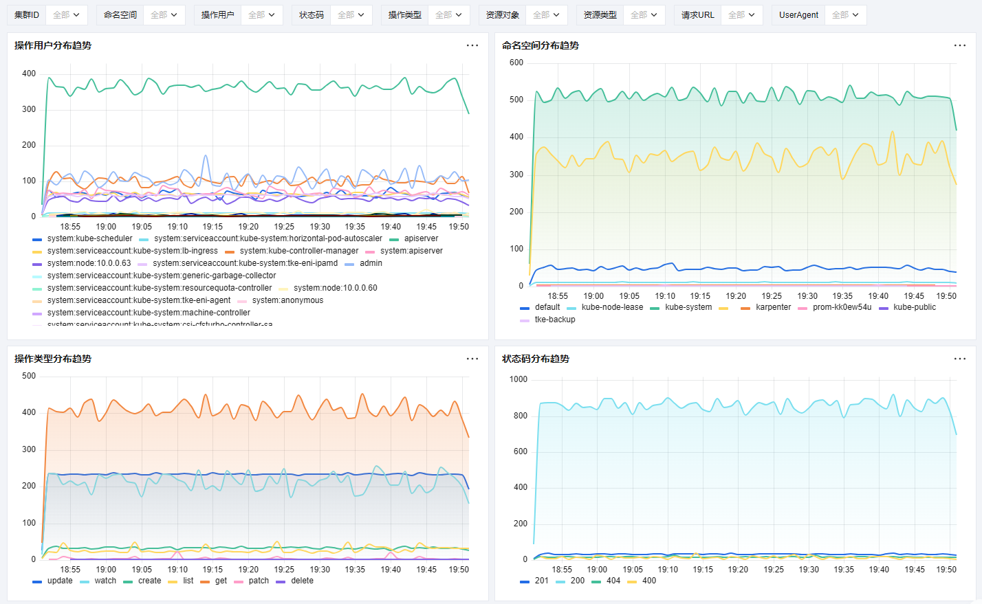 当您想观测整个集群 APIServer 操作时,可在审计总览页面设置过滤条件,查看核心审计日志的汇总统计信息,并展示一个周期内的数据对比。例如,核心审计日志的统计数、分布情况、重要操作趋势等。如下图所示: