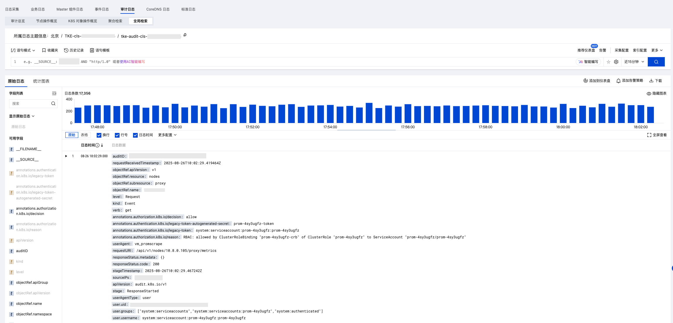 全局检索仪表盘中内嵌了日志服务 CLS 的检索分析页面,方便用户在容器服务控制台也能快速检索全部审计日志。如下图所示: