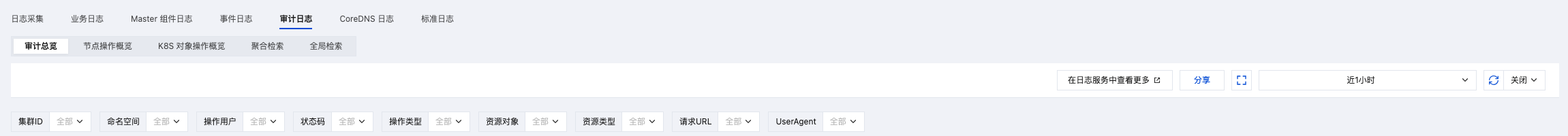 审计日志中配置了五个大盘,分别是审计总览、节点操作概览、K8S 对象操作概览、聚合检索、全局检索。请按照以下步骤进入审计日志页面,开始使用对应功能: