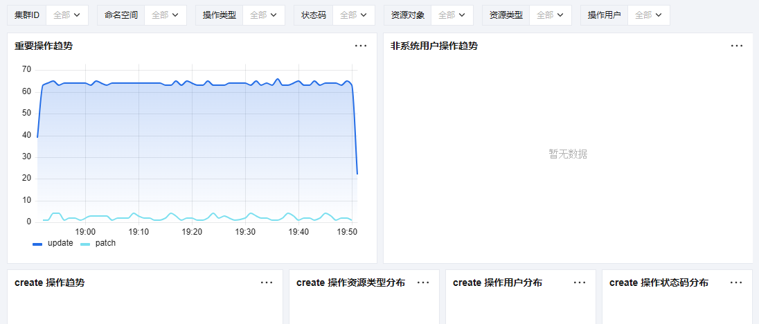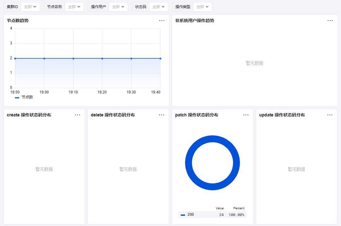 当您需要排查节点相关问题时,可在节点操作概览页面设置过滤条件,查看各类节点操作相关的仪表,包括 create、delete、patch、update、封锁、驱逐等。如下图所示: