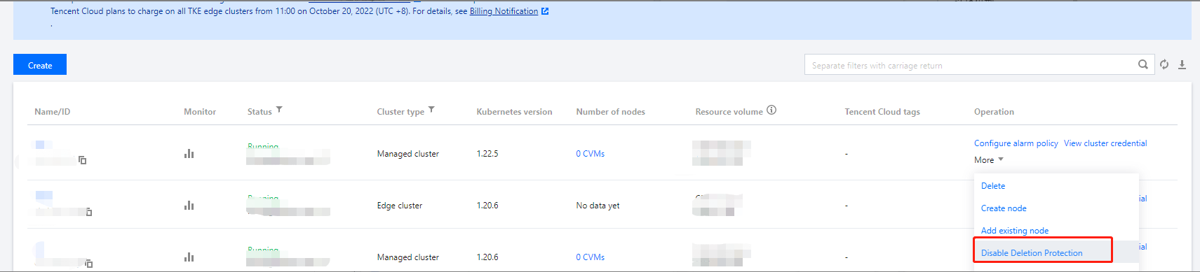 1. Select Clusters in the left navigation pane, and on the "Cluster Management" page, choose More > Disable Deletion Protection in the row where the cluster to be deleted is located, as shown below: