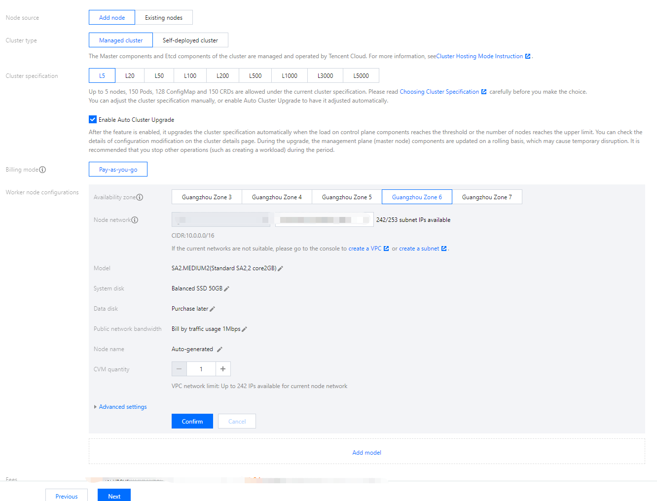 Worker node configurations: You only need to select an availability zone and the corresponding subnet and confirm the node model. Keep other default settings unchanged.