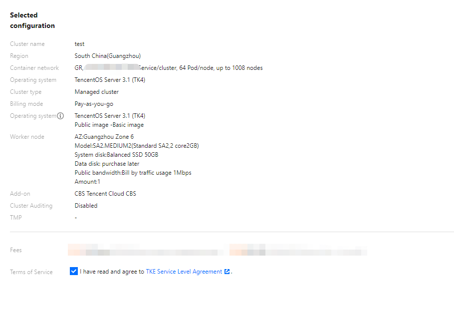 On the "Selected configuration" page, review the selected cluster configuration and costs. After reading and agreeing to the TKE Service Level Agreement, click Finish. As shown in the image below: