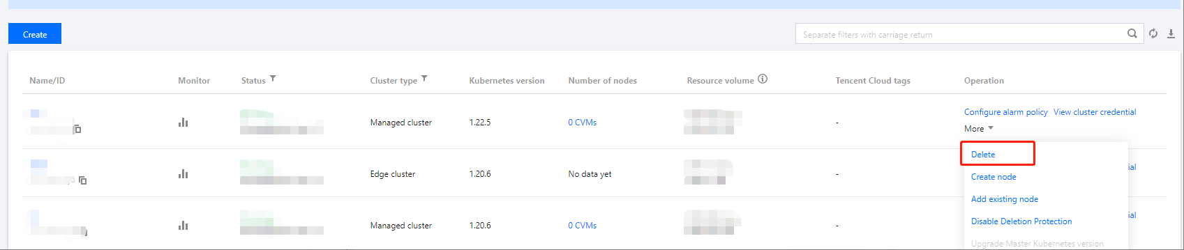 Now you know how to create and delete clusters in TKE. You can set workloads and create services in the clusters. Common tasks include: