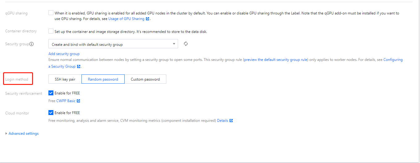 Login method: You can select SSH key pair, Random password or Custom password. Here we select "Random password".