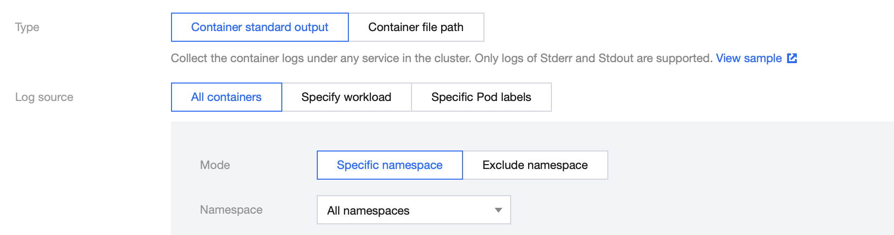 Specify workload: the containers of a specified workload under a namespace. You can add multiple namespaces.