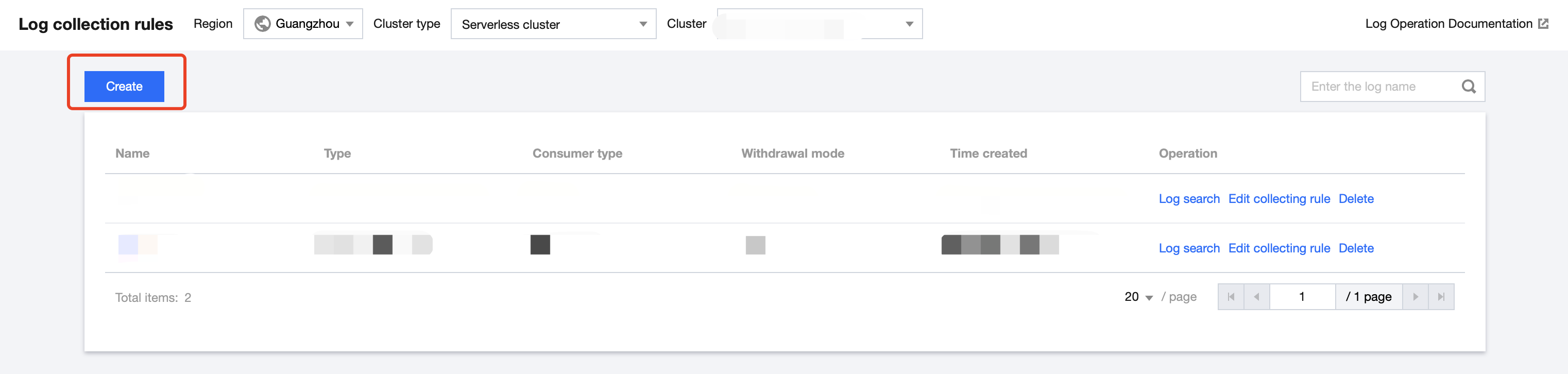 2. At the top of the "Log Collection" page, select the region and the TKE Serverless cluster for which you want to configure log collection rules. Click Create. As shown in the image below: