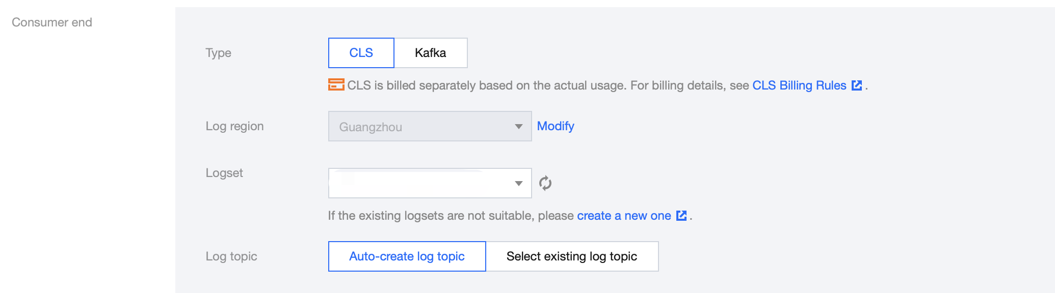 4. Configure Tencent Cloud Log Service (CLS) as the consumer end. Select the desired logset and log topic. It is recommended to choose the option to automatically create a new log topic. As shown in the figure below: