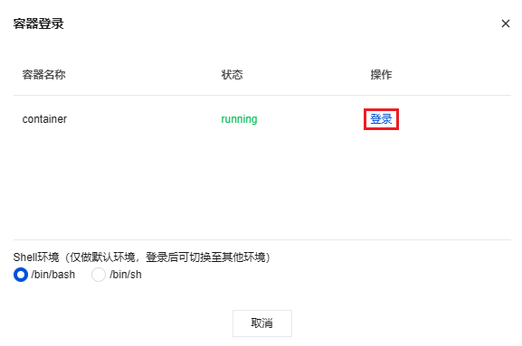 4. 当实例中的容器处于正常运行的状态,单击右侧的登录。如下图所示: