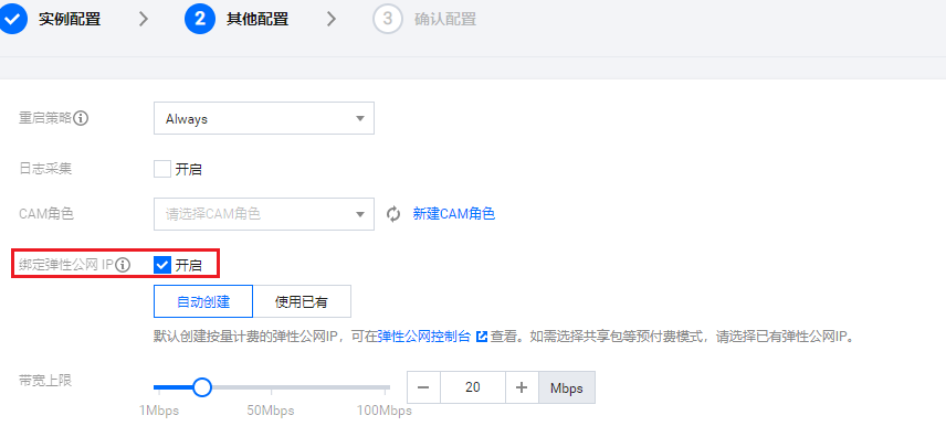 4. 开启绑定弹性公网 IP,支持以下两种绑定方式,如下图所示: