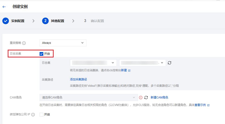 首次开启日志采集功能,需要进行授权,会默认为您的账号绑定角色 TKE_QCSLinkedRoleInEKSLog,该角色配置的预设策略为 QcloudAccessForTKELinkedRoleInEKSLog,该角色会具备日志上传等权限。开启后,选择以下参数: