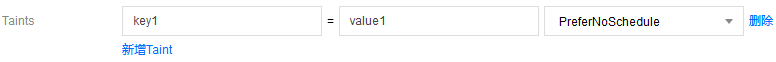Taints | 节点属性,通常与 Tolerations 配合使用。此处可为节点池下的所有节点设置 Taints,确保不符合条件的 Pod 不能够调度到这些节点上,且这些节点上已存在的不符合条件的 Pod 也将会被驱逐。Taints 内容一般由 key、value 及 effect 三个元素组成。其中 effect 可取值通常包含以下三种:PreferNoSchedule:非强制性条件,尽量避免将 Pod 调度到设置了其不能容忍的 Taint 的节点上。 NoSchedule:当节点上存在 Taint 时,没有对应容忍的 Pod 一定不能被调度。 NoExecute:当节点上存在 Taint 时,对于没有对应容忍的 Pod,不仅不会被调度到该节点上,该节点上已存在的 Pod 也会被驱逐。以设置 Taints key1=value1: PreferNoSchedule 为例,控制台配置如下图所示: ![]() |