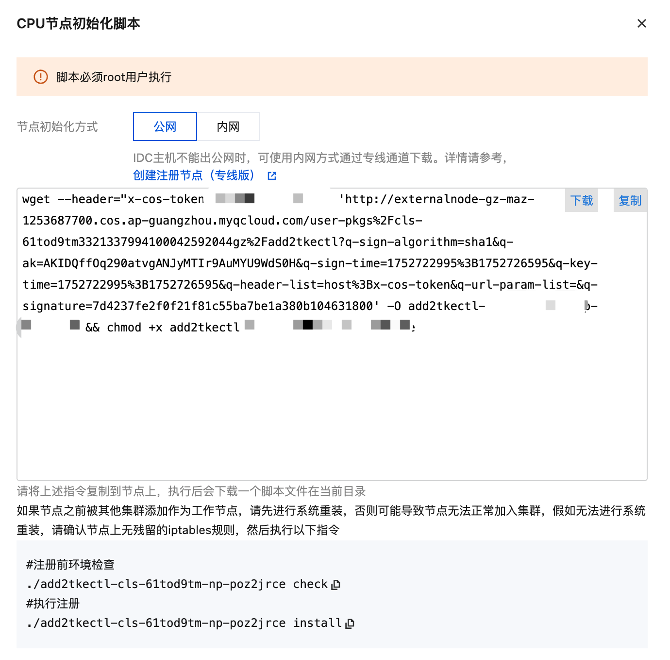 脚本下载链接1小时后过期。因为脚本通过 COS 下载,所以您需要确保 IDC 节点能够通过内网/外网访问 COS。