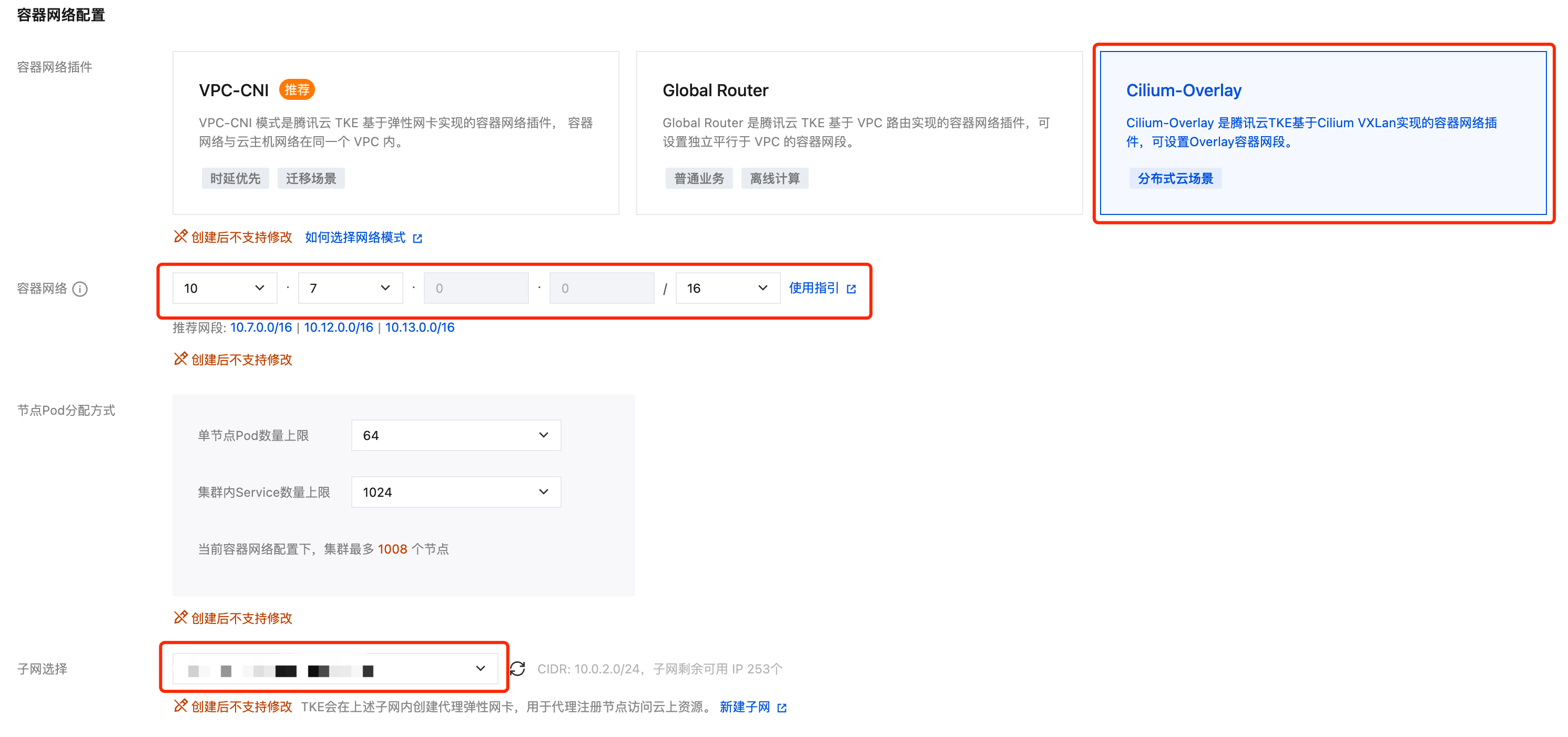 容器网络插件:此处需选择 Cilium-Overlay(注意:仅支持操作系统 TencentOS Server 2.4/2.6/3.1/3.2 选择)。