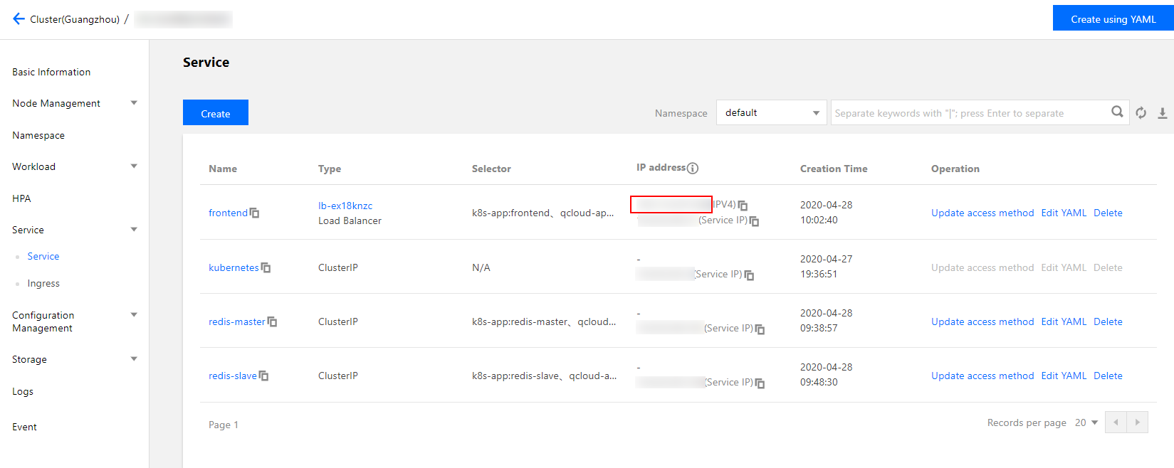 When creating the frontend service, because the access mode Via Internet was set, this service has a cloud load balancer (public IP) and a private IP, so it can be accessed by other services in the cluster and can also be accessed via public network.